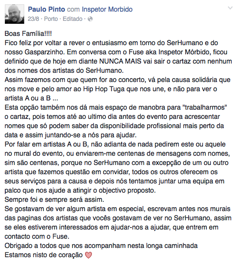 Para quem não está familiarizado com o evento, o Ser Humano trata-se de um grupo de artistas/amigos que se juntam com o objectivo de ajudar o Gaspar - filho do Fuse.